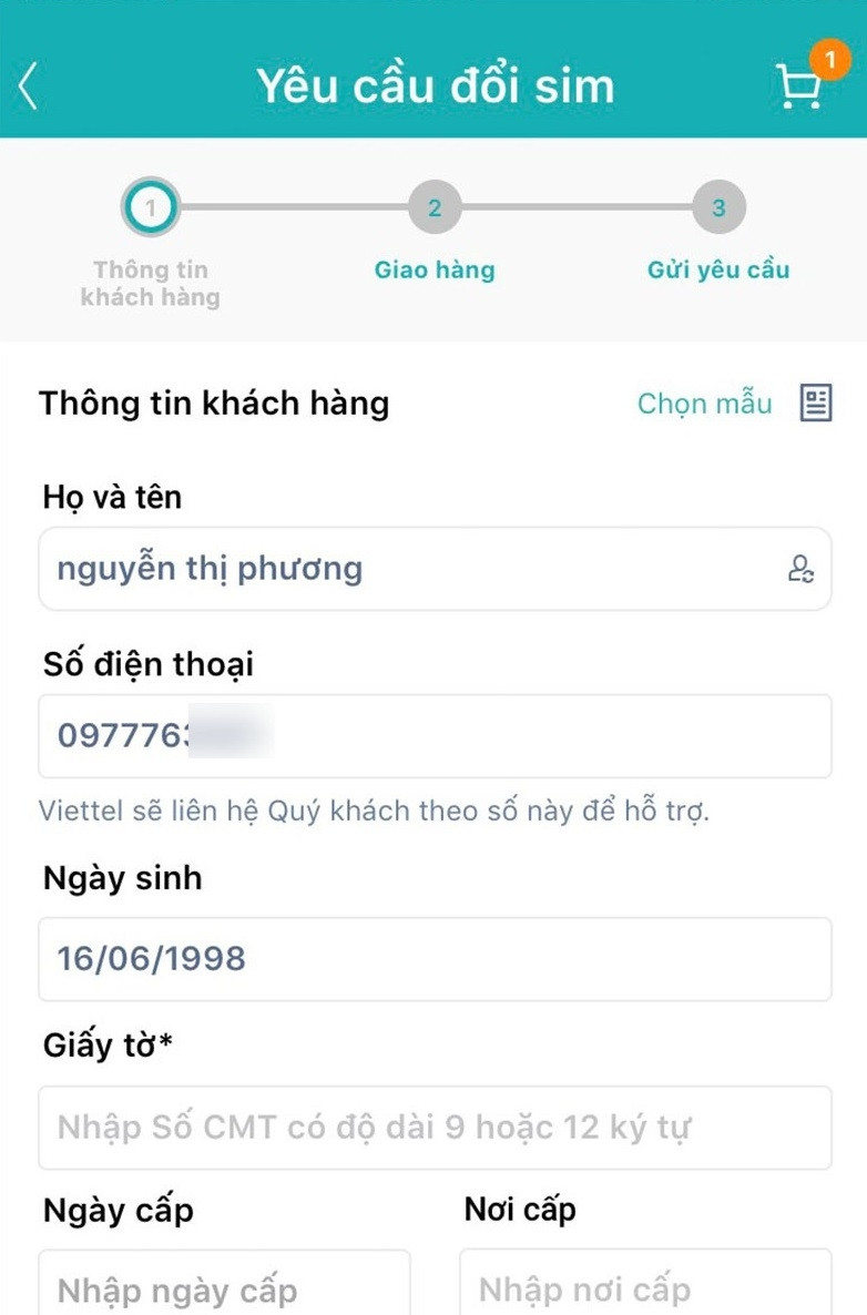Sau khi chọn mục này, hệ thống sẽ hiển thị thông tin về chi phí dịch vụ, dao động quanh mức 25.000 đồng. Bạn cần xác nhận đồng ý và sau đó điền đầy đủ các thông tin cá nhân được yêu cầu để xác minh danh tính. Bước tiếp theo là lựa chọn hình thức nhận SIM. Bạn có thể chọn nhận tại cửa hàng (miễn phí giao hàng) hoặc yêu cầu giao SIM mới đến địa chỉ mong muốn.