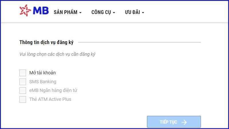 Chọn dịch vụ mở tài khoản và ngân hàng điện tử MB để hoàn tất đăng ký