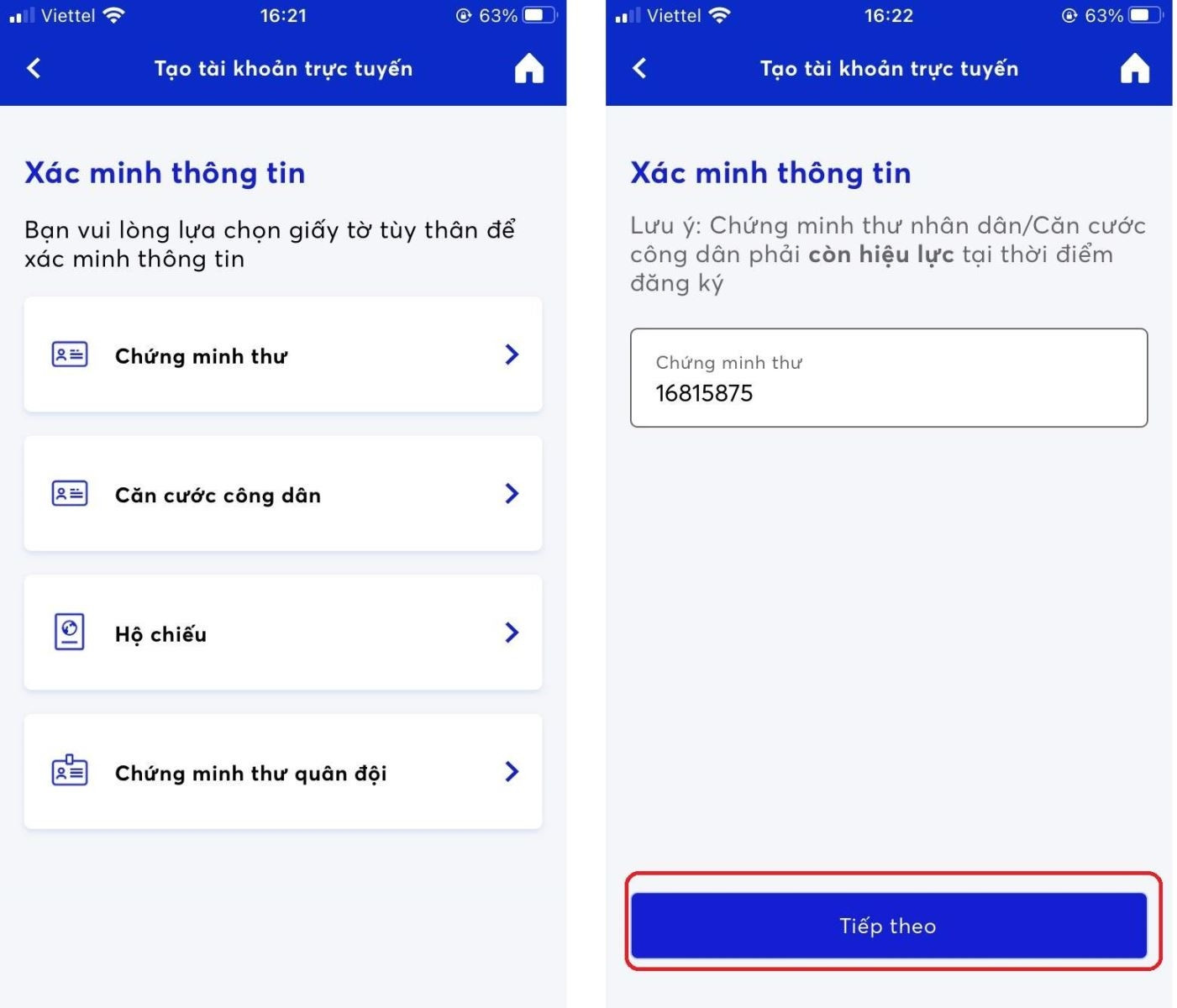 Kế đến, ứng dụng sẽ yêu cầu bạn cung cấp thông tin giấy tờ tùy thân, bao gồm số giấy tờ và các chi tiết liên quan. Bạn sẽ cần chụp ảnh hai mặt của giấy tờ tùy thân (CCCD/CMND/Hộ chiếu) theo hướng dẫn trên màn hình để xác minh thông tin. Sau đó là bước xác thực khuôn mặt bằng cách sử dụng tính năng nhận diện của ứng dụng.