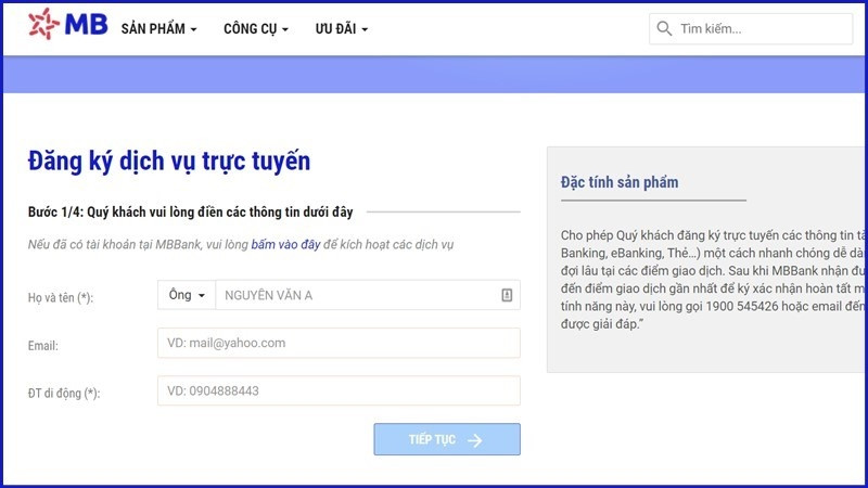 Các bước tiếp theo sẽ yêu cầu bạn điền thông tin chi tiết hơn về bản thân, bao gồm địa chỉ thường trú, nơi ở hiện tại và các thông tin liên quan khác. Hãy điền cẩn thận vào tất cả các mục để đảm bảo độ chính xác. Cuối cùng, bạn sẽ được lựa chọn các dịch vụ mà mình muốn đăng ký, chẳng hạn như “Mở tài khoản” và “eMB Ngân hàng điện tử”. Sau khi đã chọn xong, nhấn “Tiếp tục” để hoàn tất quá trình đăng ký.