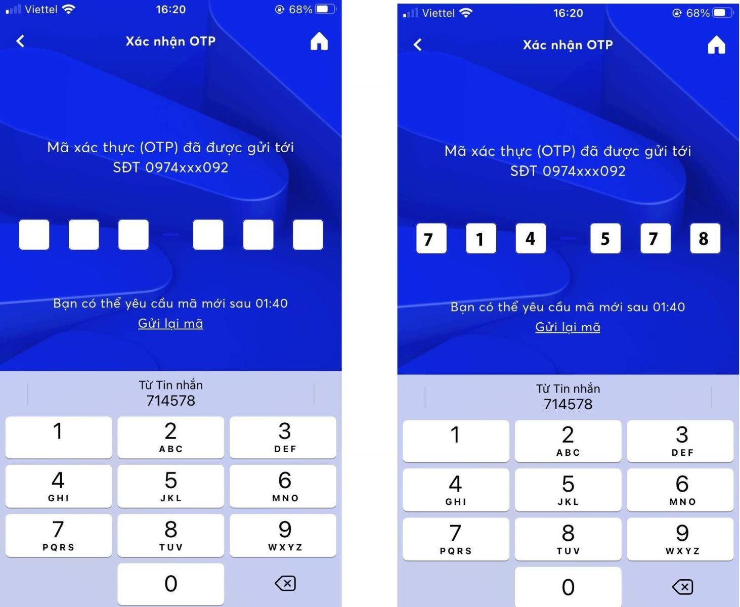 Màn hình nhập mã OTP để xác thực số điện thoại trên ứng dụng MB Bank