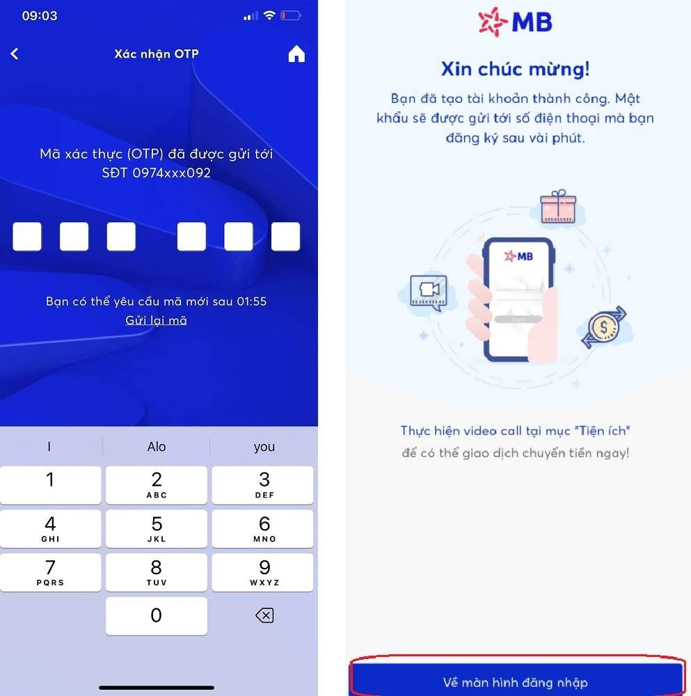 Xác nhận mã OTP để hoàn tất quá trình đăng ký thẻ MB Bank trực tuyến
