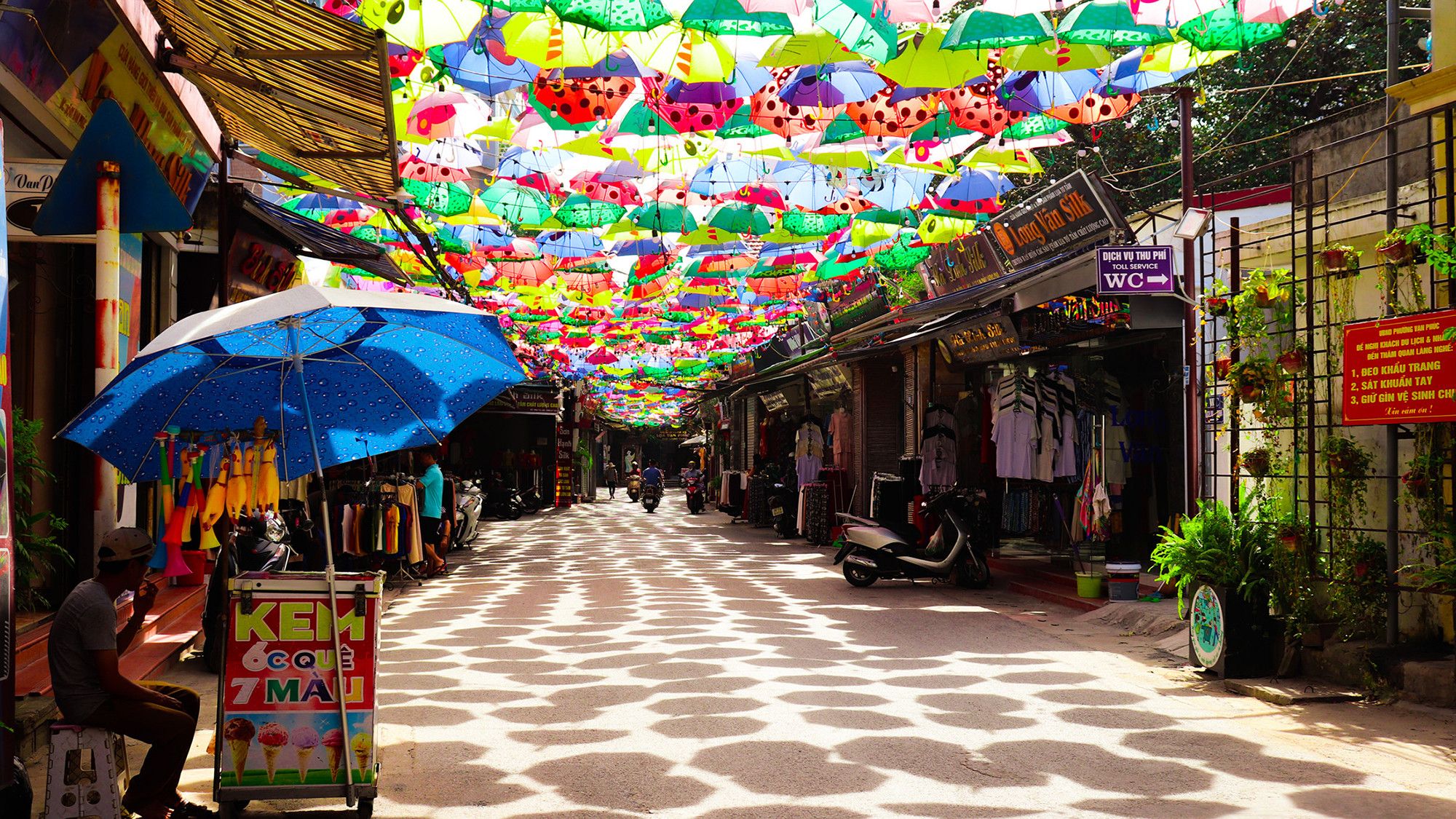 Con đường ô dù đầy màu sắc tạo nên điểm nhấn đặc biệt của làng lụa Vạn Phúc