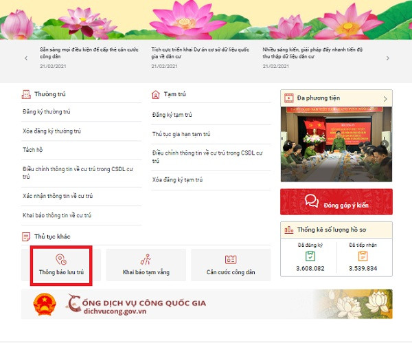 - Sau khi đăng nhập thành công, tìm và chọn mục “Thông báo lưu trú” (thường nằm ở cuối trang hoặc trong phần quản lý thông tin cá nhân).