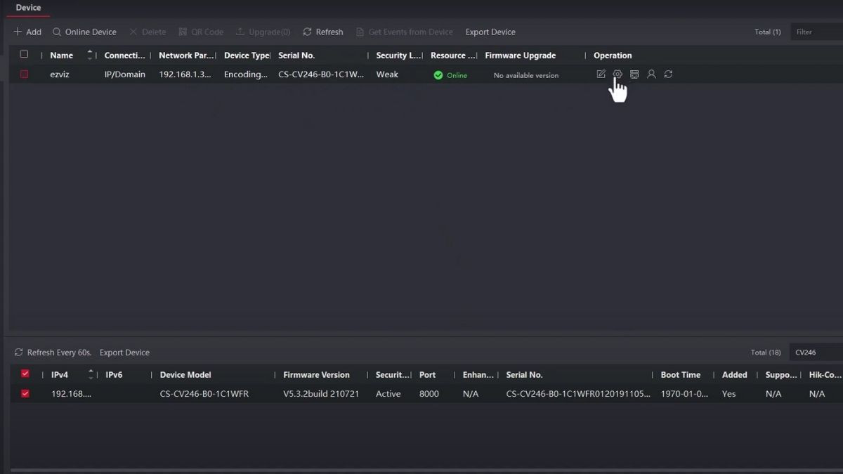 Nhấn vào biểu tượng bánh răng để vào cài đặt camera EzvizTruy cập cài đặt camera Ezviz trong IVMS-4200.