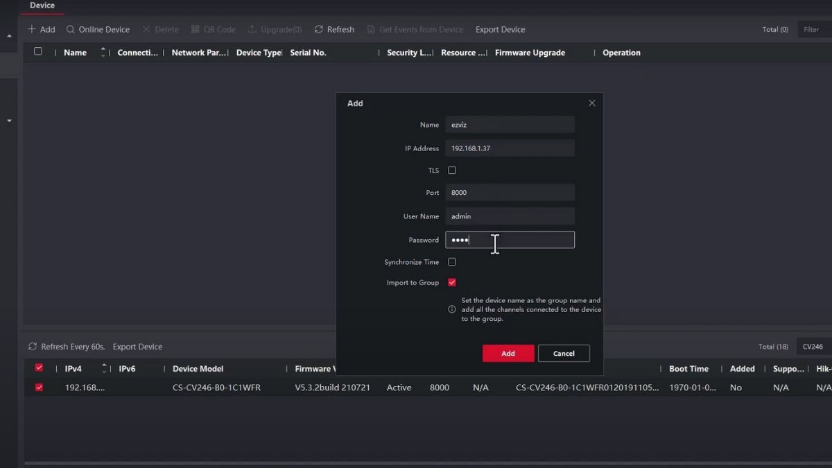 - Bước 1: Tải và cài đặt phần mềm SADP Tool và IVMS-4200 từ trang web chính thức của Hikvision/Ezviz. Sau khi cài đặt, mở SADP Tool để tìm kiếm camera trên mạng cục bộ và tiến hành thiết lập mật khẩu cho camera (nếu chưa có). Tiếp theo, kết nối camera với phần mềm IVMS-4200.