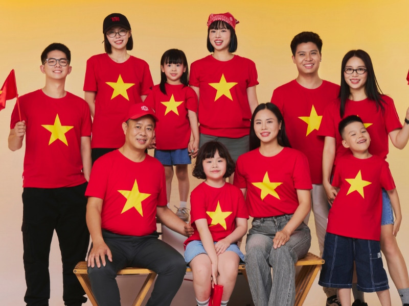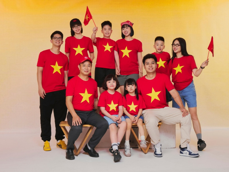 Hình ảnh gia đình mặc áo cờ đỏ sao vàng, thể hiện tinh thần yêu nước