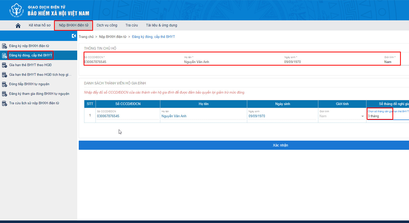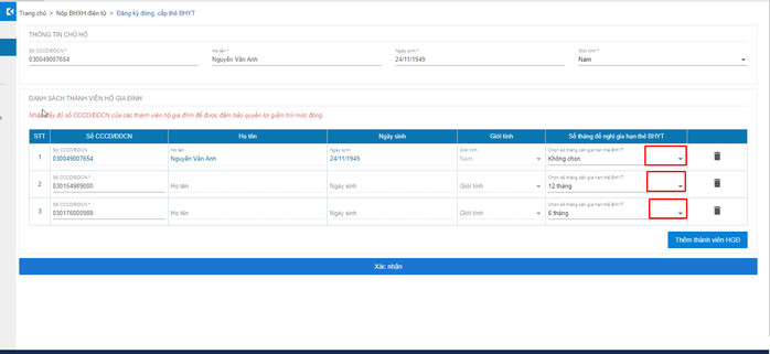 Đối với các thành viên hộ gia đình, bạn chọn “Thêm thành viên HGĐ” và nhập số định danh cá nhân/CCCD của từng người. Đây là điểm mấu chốt để được hưởng quyền lợi giảm trừ mức đóng theo quy định. Ví dụ, thành viên thứ hai đóng 70% mức đóng của thành viên thứ nhất, thành viên thứ ba đóng 60%, và cứ thế giảm dần. Hệ thống sẽ tự động tính toán mức đóng chính xác sau khi bạn cung cấp đủ thông tin. Sau khi điền xong thông tin cá nhân và thành viên hộ gia đình, bạn cần lựa chọn số tháng đăng ký đóng BHYT. Người tham gia có thể lựa chọn từ 3, 6, 9 hoặc 12 tháng tùy theo nhu cầu. Nhấn “Xác nhận” để hệ thống tiến hành xác thực thông tin. Nếu có sai sót hoặc thành viên không cùng đăng ký thường trú/tạm trú, hệ thống sẽ thông báo để bạn điều chỉnh, đảm bảo dữ liệu chính xác trước khi tiếp tục mua bảo hiểm y tế online.