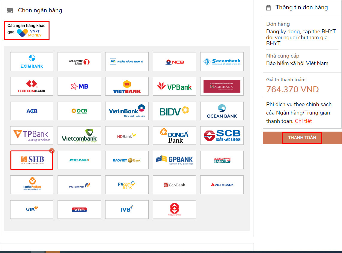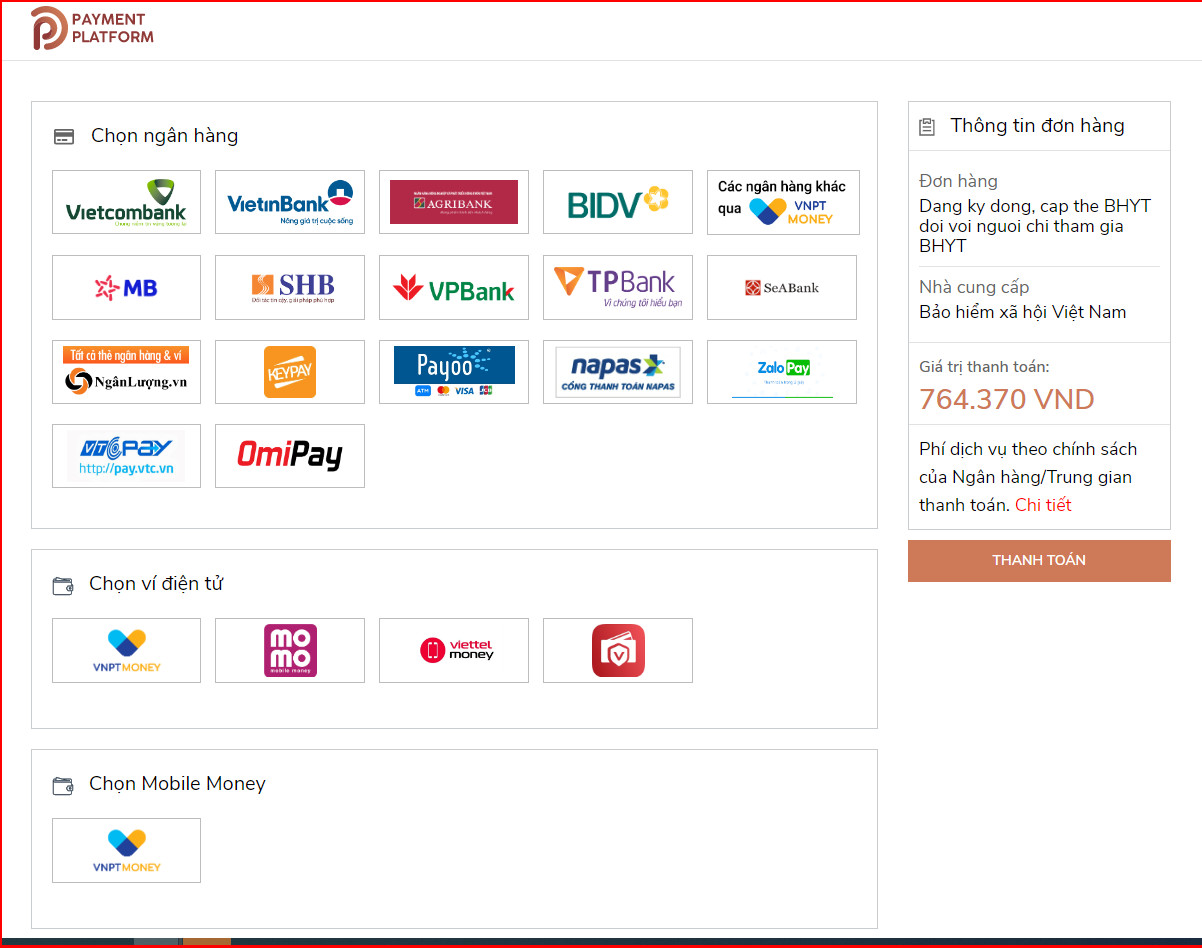 Chọn ngân hàng hoặc trung gian thanh toán BHYT trực tuyến