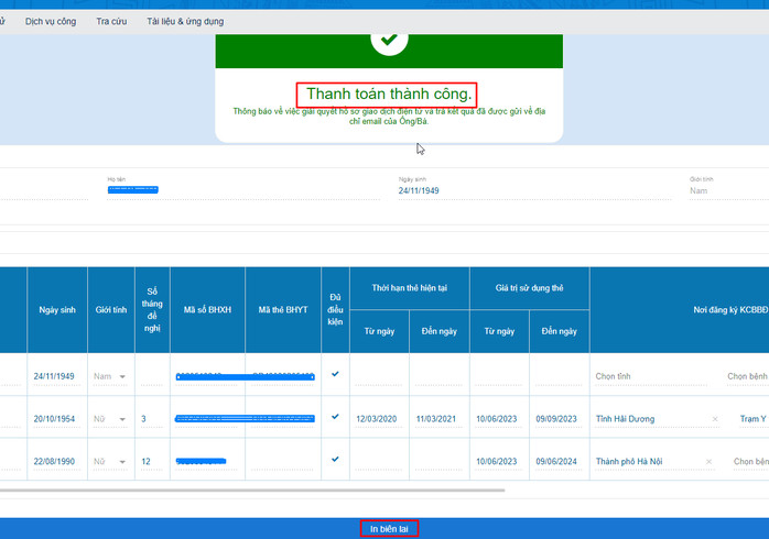 Sau khi thanh toán thành công, hệ thống sẽ hiển thị thông báo. Bạn có thể chọn “In biên lai” để lưu trữ chứng từ thanh toán. Để xem lại lịch sử giao dịch, bạn vào menu bên trái và chọn “Tra cứu lịch sử nộp BHXH điện tử/Lịch sử đăng ký tham gia BHYT theo HGĐ”. Điều này giúp bạn dễ dàng theo dõi tình trạng hồ sơ và đảm bảo quyền lợi khi đăng ký BHYT qua internet.