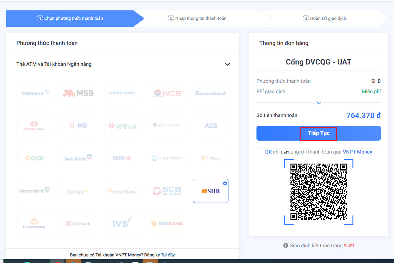 Giao diện chọn ngân hàng thanh toán qua trung gian