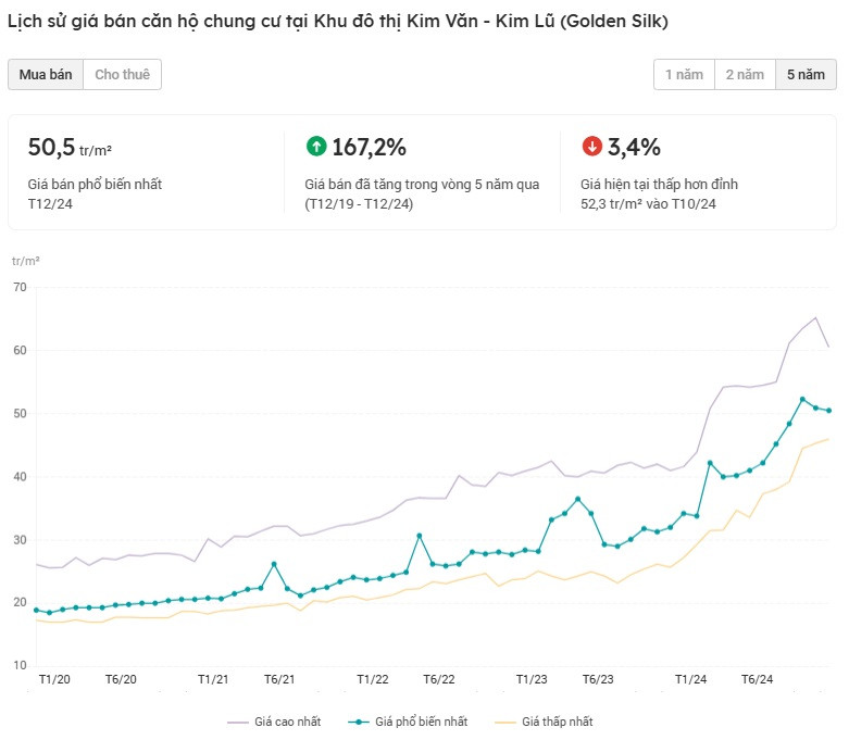 Dù các sự cố liên tiếp xảy ra, làm ảnh hưởng không nhỏ tới cuộc sống sinh hoạt hàng ngày, nhưng theo khảo sát, giá rao bán căn hộ tại Khu đô thị Kim Văn – Kim Lũ vẫn đạt mức cao đáng ngạc nhiên, lên đến 50,5 triệu đồng/m2. Mức giá này đã có sự điều chỉnh giảm nhẹ 3,4% so với đỉnh điểm 52,3 triệu đồng/m2 vào tháng 10/2024, nhưng vẫn cao hơn đáng kể so với các giai đoạn trước đó. Cụ thể, vào tháng 1/2020, giá trung bình tại đây chỉ khoảng 18,5 triệu đồng/m2, cho thấy mức tăng gần 3 lần trong vòng 5 năm.