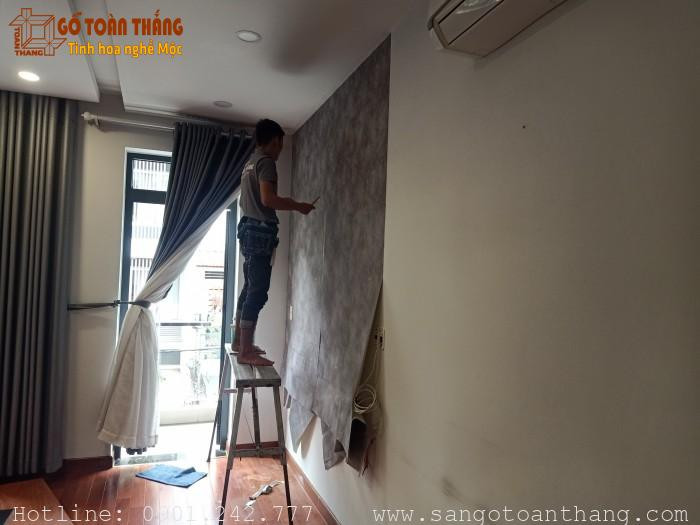 Hình ảnh người đang thi công dán decal lên tường, minh họa sự dễ dàng khi sử dụng loại vật liệu này.