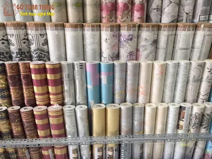 Bộ sưu tập các cuộn decal dán tường với nhiều màu sắc và hoa văn khác nhau, mang đến lựa chọn phong phú.