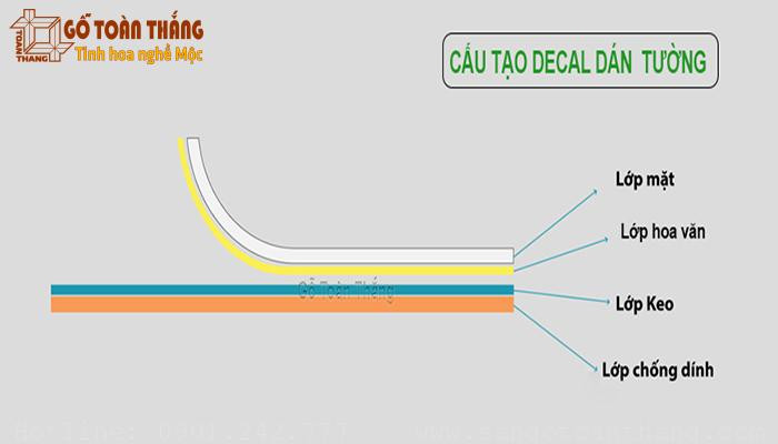 Sơ đồ mô tả cấu tạo đa lớp của decal dán tường, từ lớp bề mặt đến lớp keo và lớp bảo vệ.