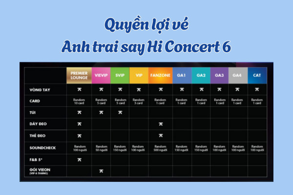 Minh họa chi tiết quyền lợi và đặc quyền của từng hạng vé khi mua vé Concert Anh Trai Say HiMinh họa chi tiết quyền lợi và đặc quyền của từng hạng vé khi mua vé Concert Anh Trai Say Hi