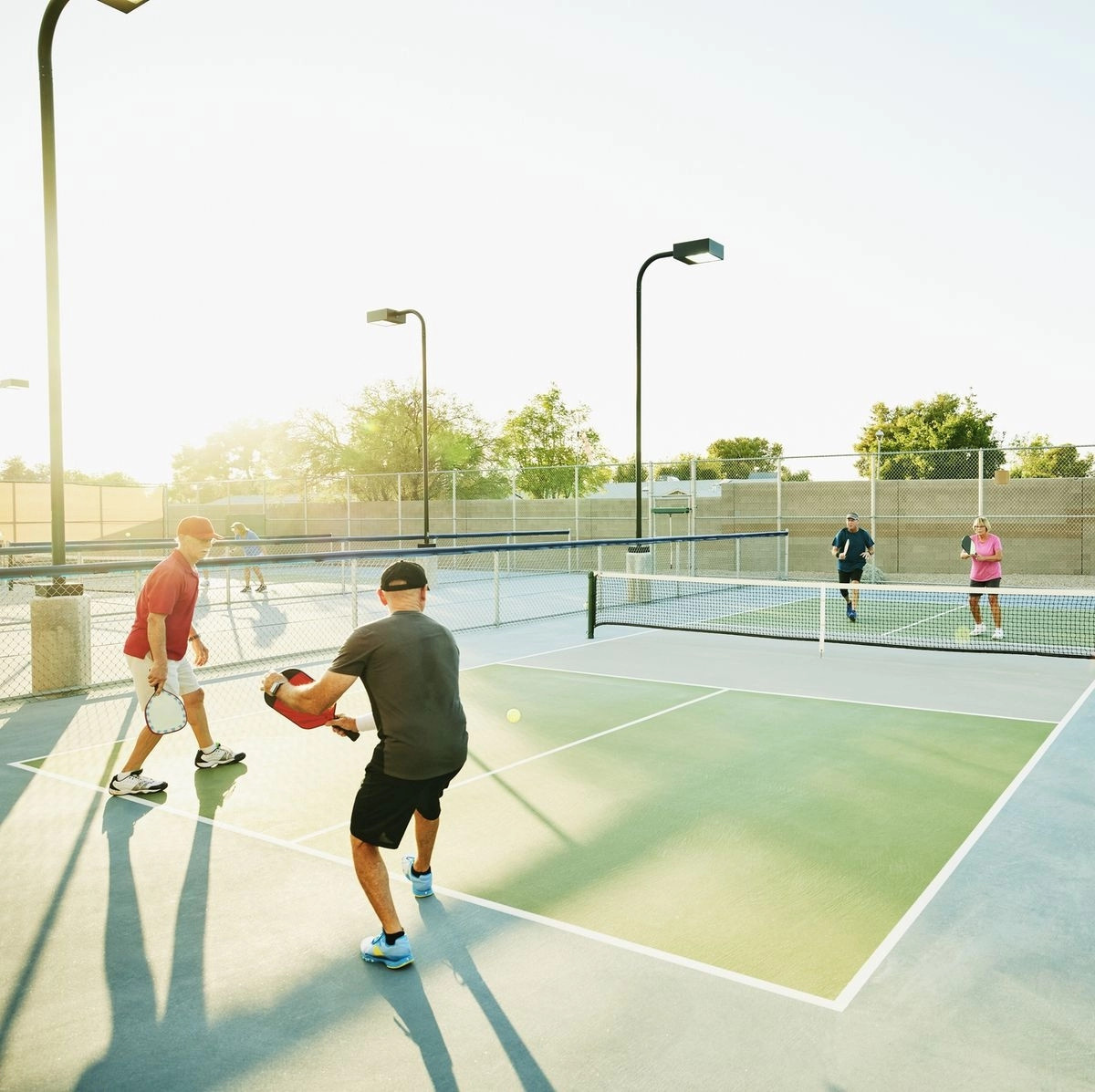 Một nhóm bạn đang vui vẻ chơi pickleball, cho thấy sự đa dạng của người chơi khi tìm mua vợt pickleball ở TPHCM