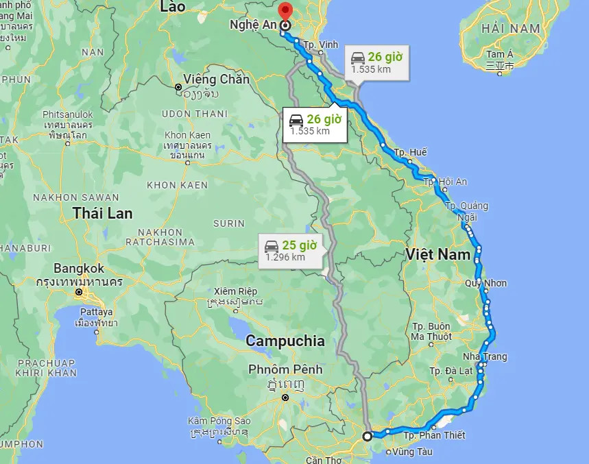 Khoảng cách từ Thành phố Hồ Chí Minh đến Nghệ An là một trong những tuyến đường dài nhất trên bản đồ Việt Nam, nối liền vùng kinh tế trọng điểm phía Nam với khu vực Bắc Trung Bộ. Dựa trên dữ liệu từ Google Maps, quãng đường di chuyển bằng đường bộ giữa hai địa điểm này dao động khoảng 1.535 km nếu đi theo các tuyến đường quốc lộ và đường cao tốc chính như CT02/QL14 hoặc Quốc lộ 1A. Đây là một hành trình đòi hỏi thời gian đáng kể, thường mất từ 26 giờ đồng hồ di chuyển liên tục bằng phương tiện đường bộ hoặc đường sắt.