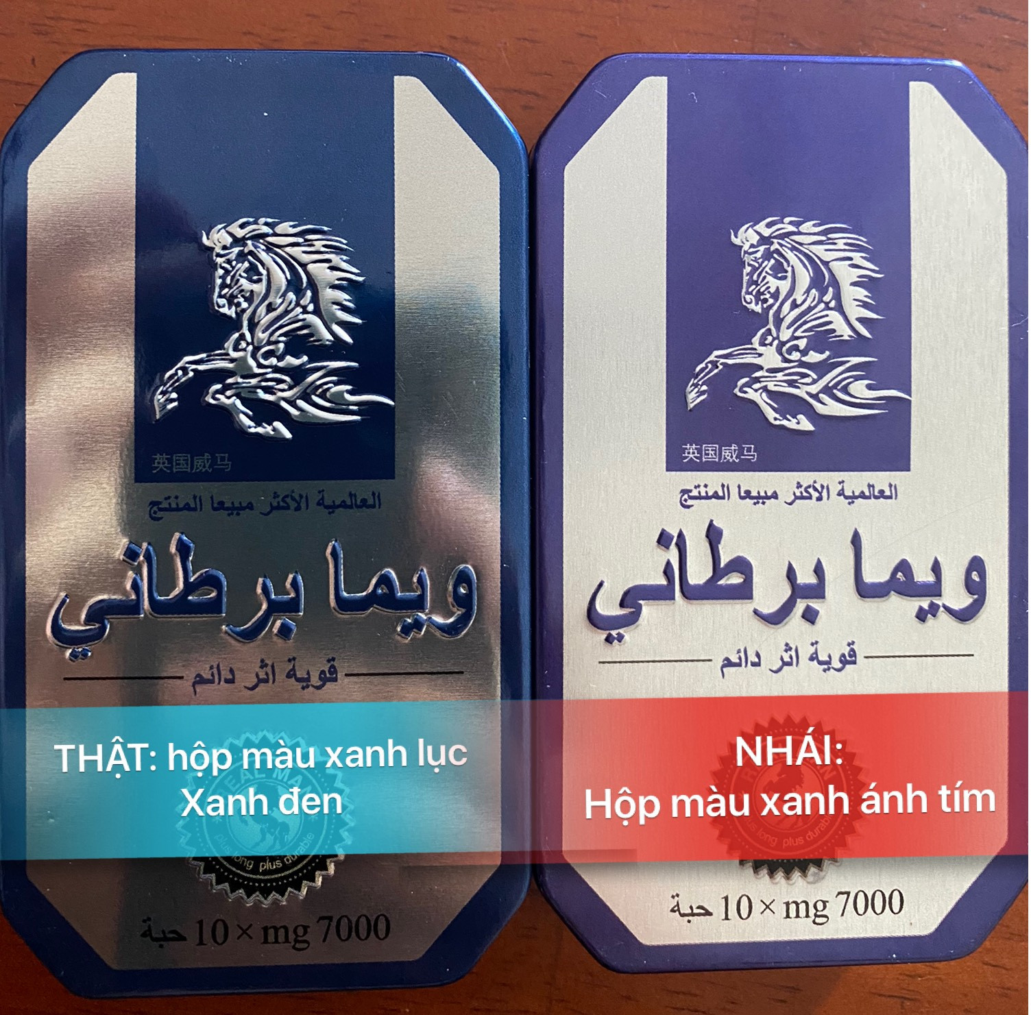So sánh màu sắc vỏ hộp Ngựa Thái thật (xanh lục đậm) và giả (xanh ánh tím)
