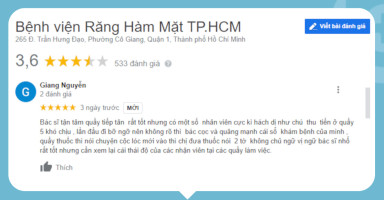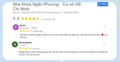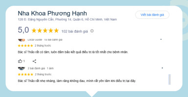 Theo tìm hiểu của BookingCare trên Google, Nha khoa Phương Hạnh nhận được nhiều phản hồi tích cực từ người bệnh thăm khám, đặc biệt về chuyên môn của bác sĩ Thảo và sự chu đáo của đội ngũ nhân viên. Bác sĩ Thảo có lịch khám linh hoạt tại các cơ sở, do đó, bạn đọc muốn thăm khám và tư vấn trực tiếp cùng bác sĩ có thể chủ động liên hệ đặt lịch trước để được phục vụ tốt nhất.