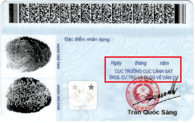 Mặt sau của thẻ căn cước công dân mã vạch cho thấy vị trí nơi cấp ở góc dưới cùng bên phải