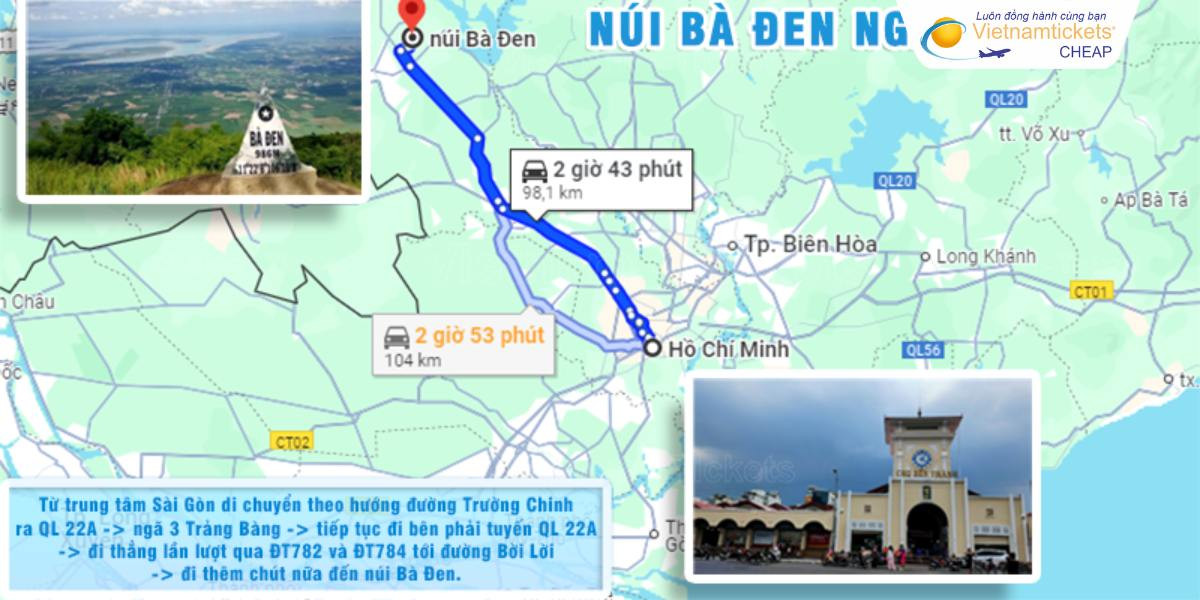 Khoảng cách từ trung tâm TP.HCM đến núi Bà Đen tại Tây Ninh là khoảng 97km về phía Tây Bắc.