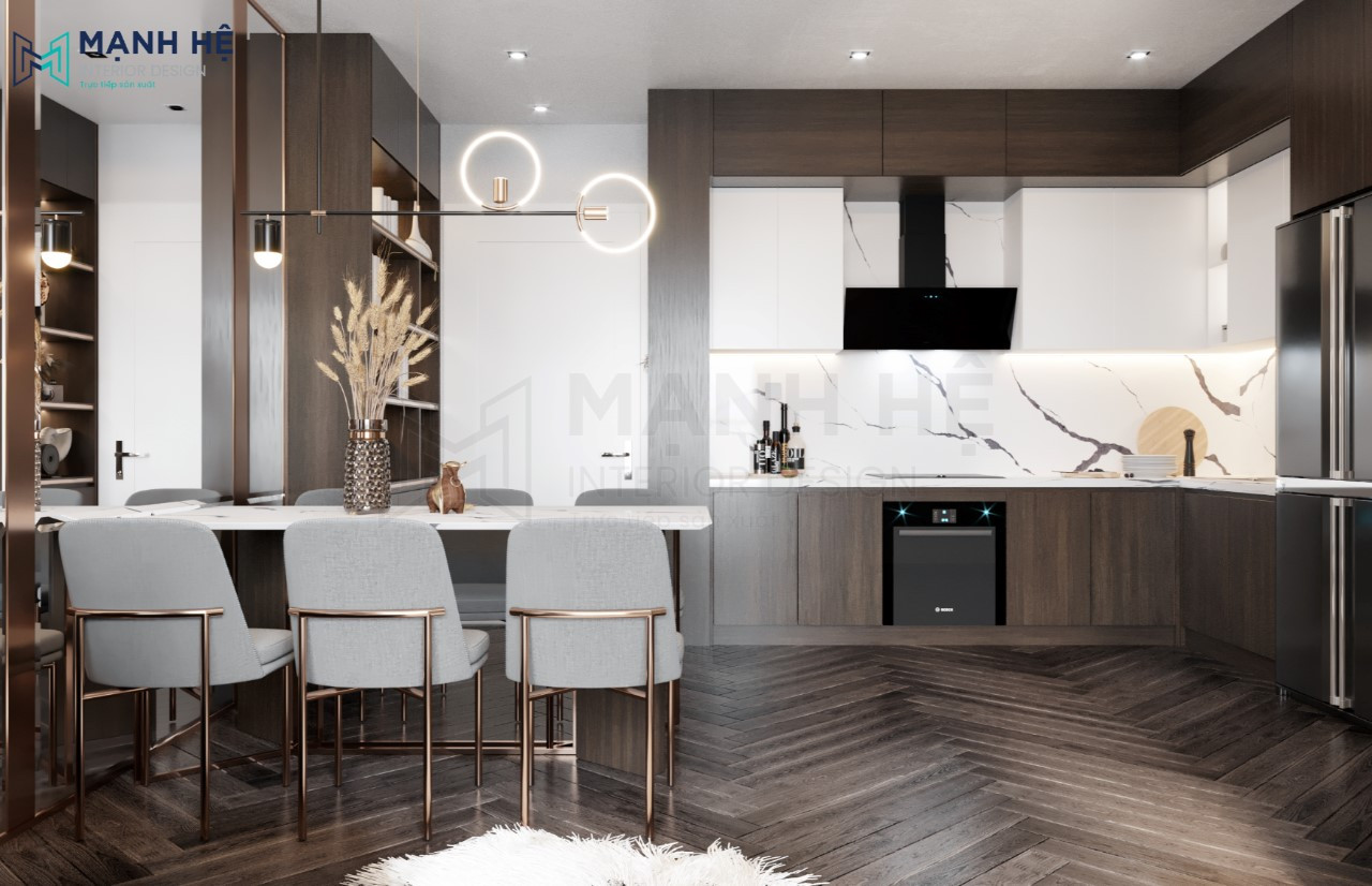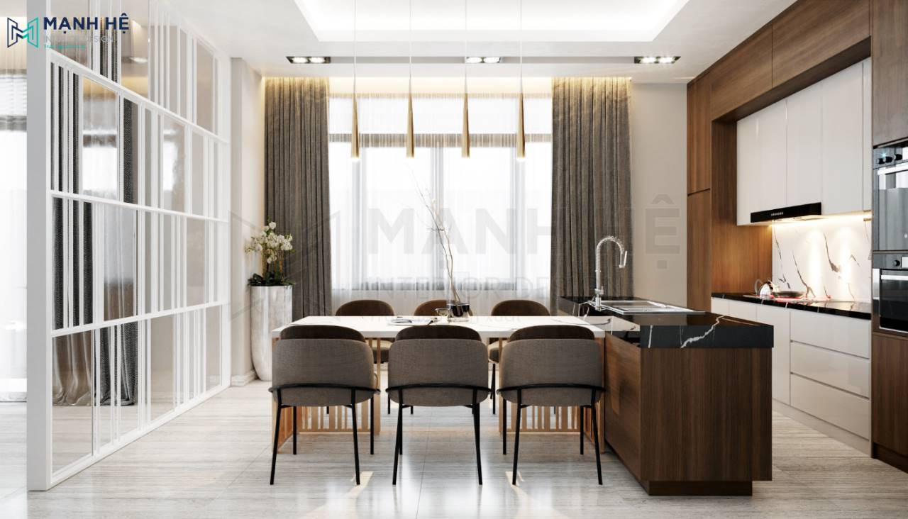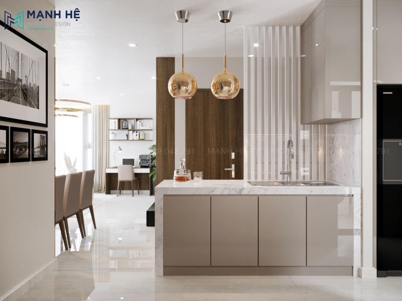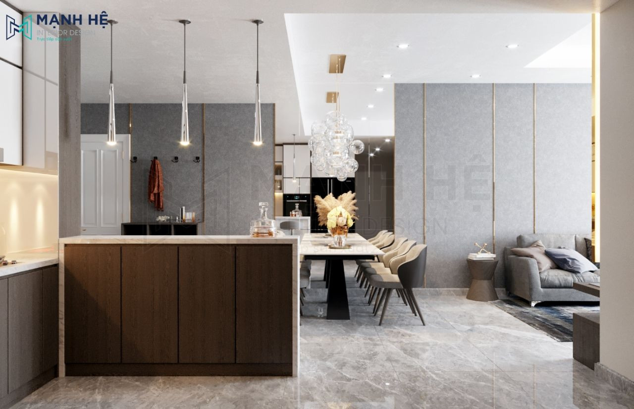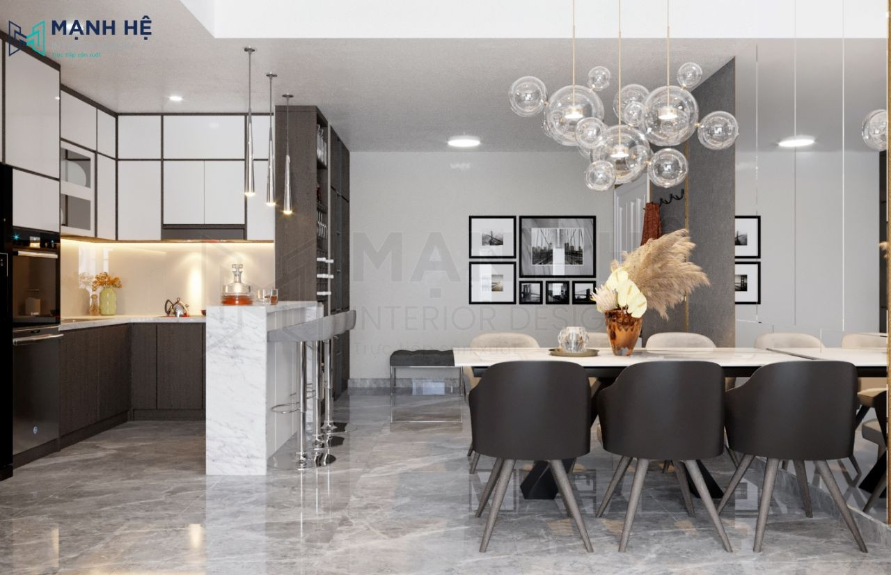 Mẫu 14: Thiết Kế Phòng Bếp Chung Cư Liền Phòng Khách Với Bàn Ăn Ngăn Cách 2 Gian
