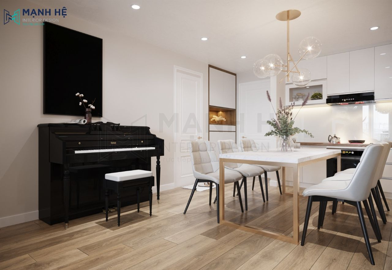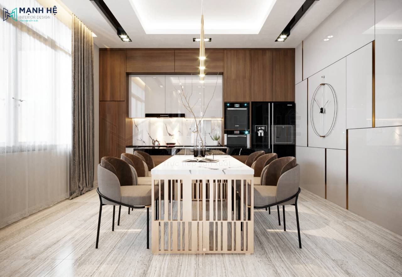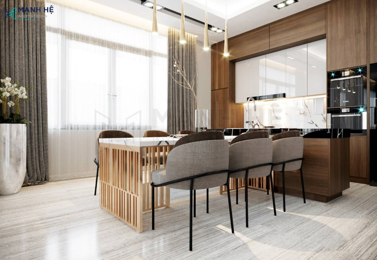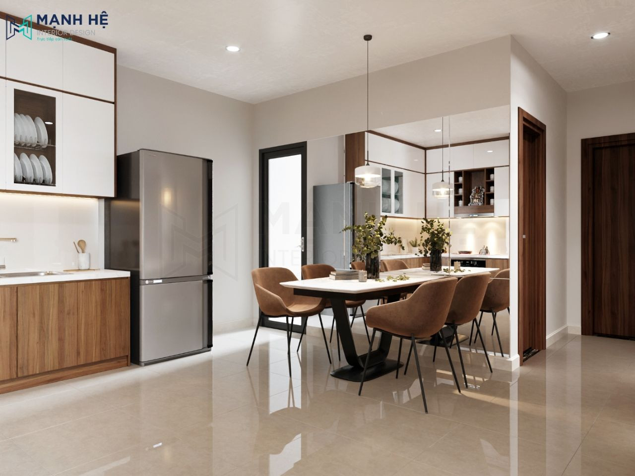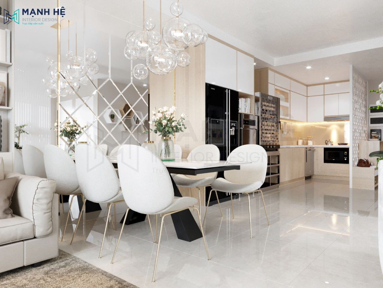 Mẫu 14: Thiết Kế Phòng Bếp Chung Cư Liền Phòng Khách Với Bàn Ăn Ngăn Cách 2 Gian