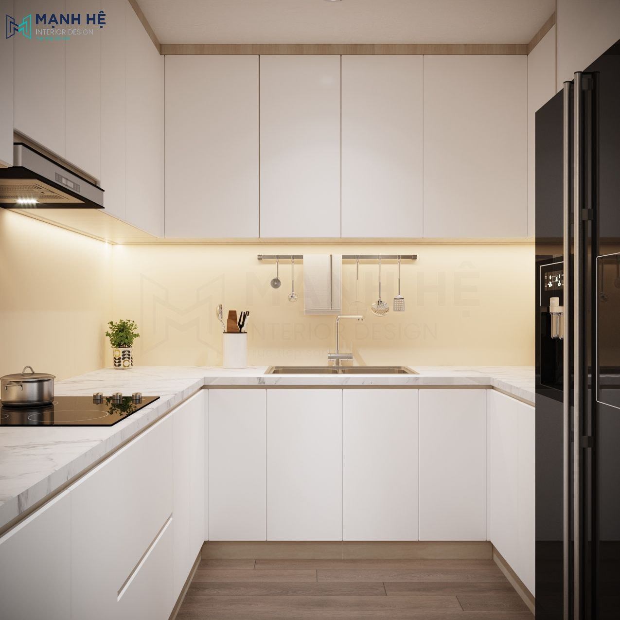 Không gian nội thất phòng bếp chung cư có vẻ gần gũi nhờ thiết kế bếp chữ U