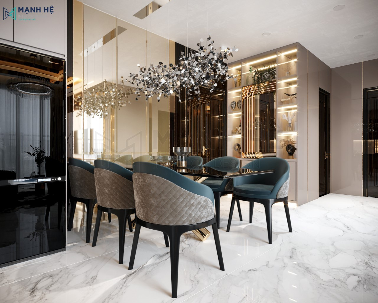 Ốp vách kính cho tường cạnh bàn ăn sang trọng, hiện đại, tạo chiều sâu không gian