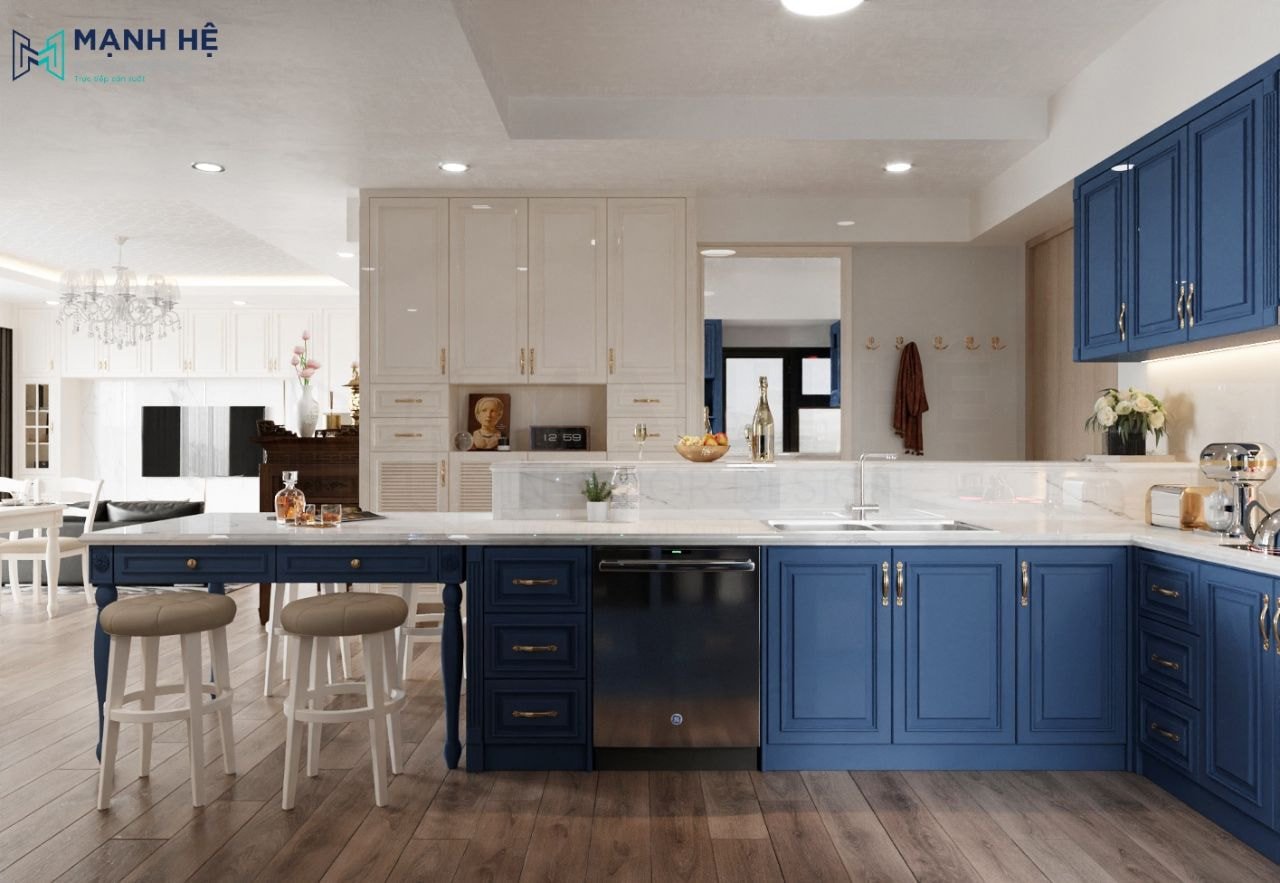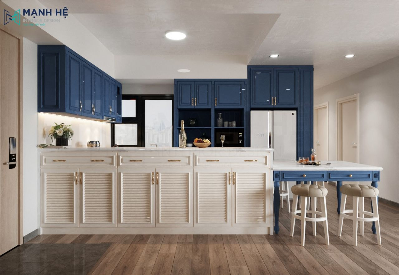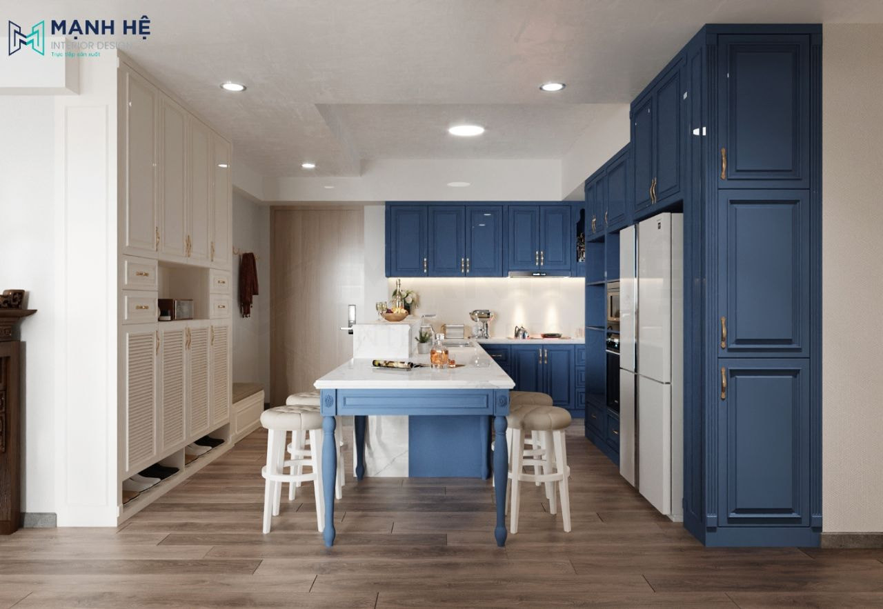 Mẫu 17: Thiết Kế Phòng Bếp Chung Cư Tân Cổ Điển Màu Xanh Nổi Bật