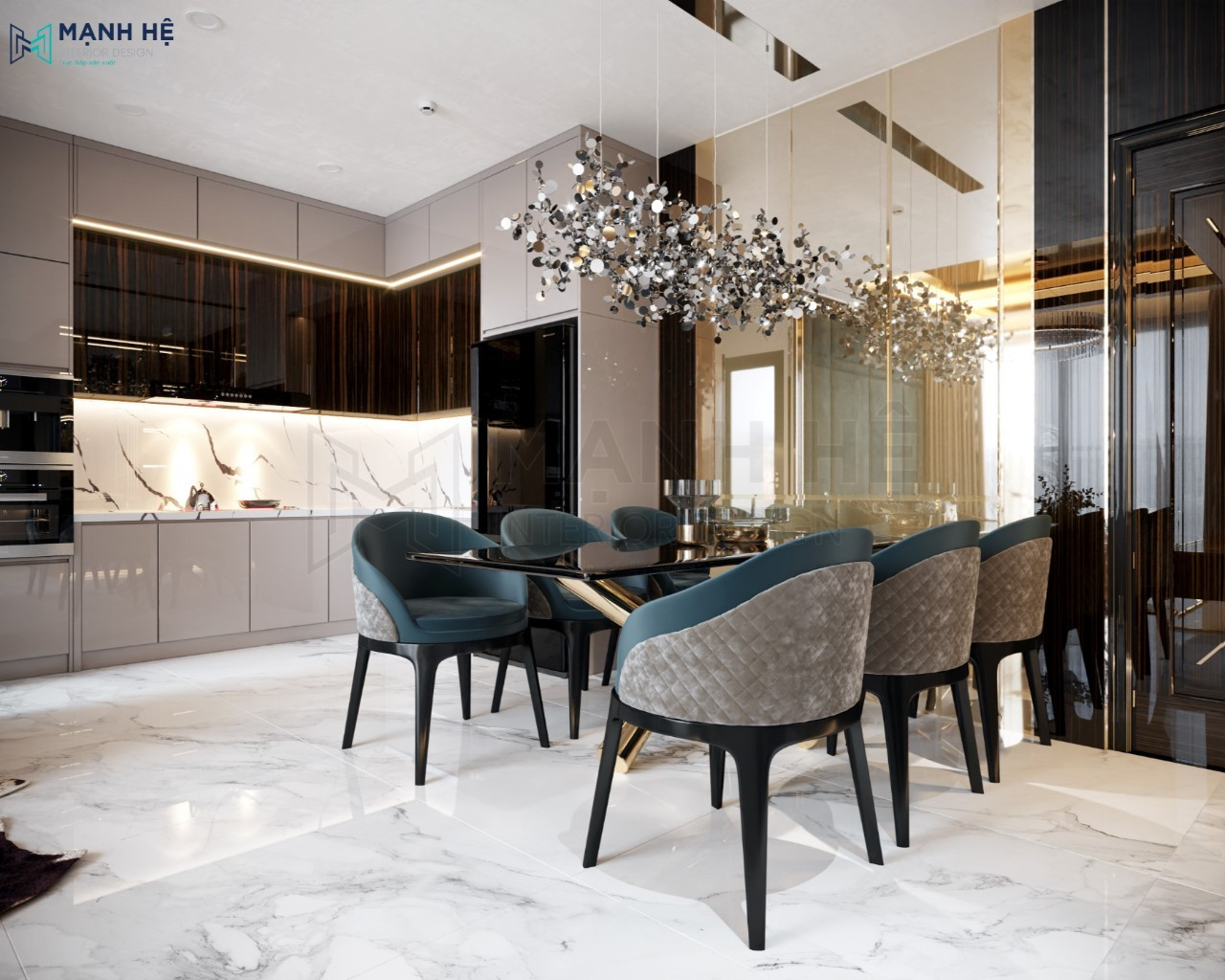 Bàn ăn mặt đá marble sang trọng với gam xám quyến rũ làm điểm nhấn cho không gian