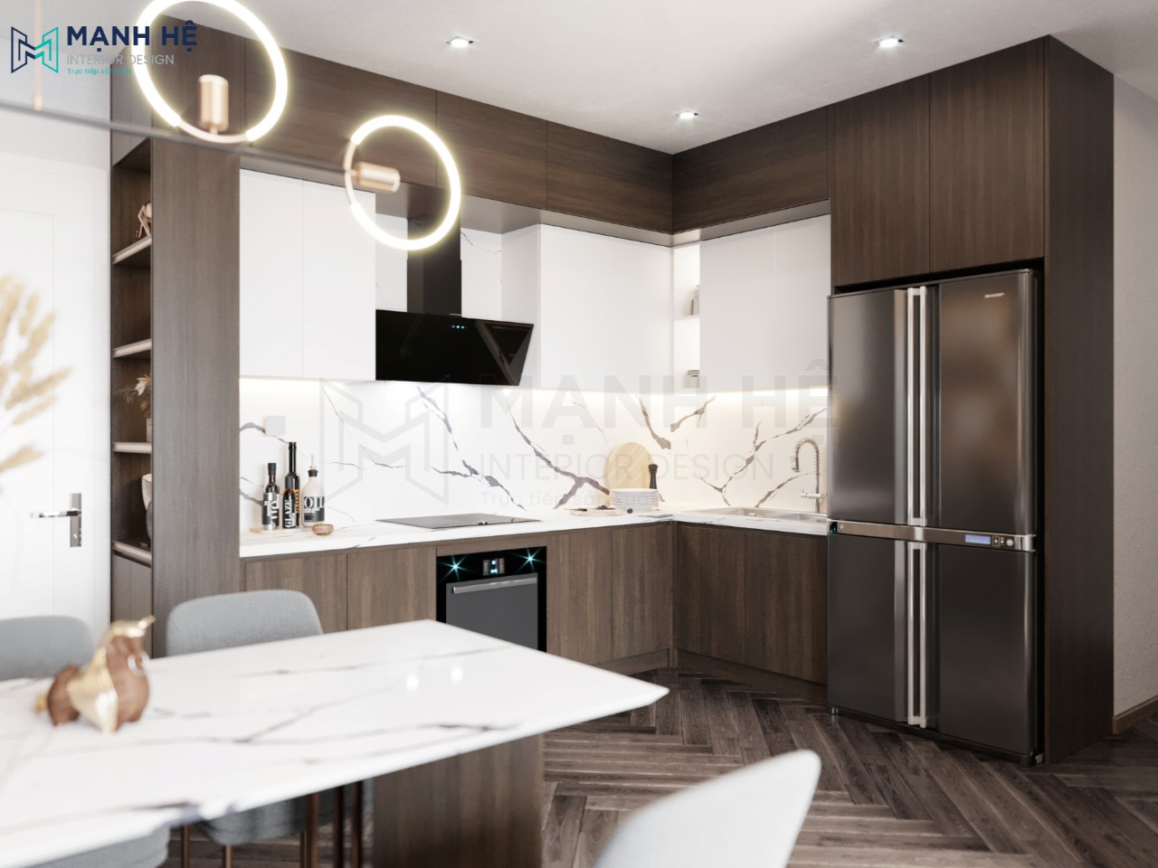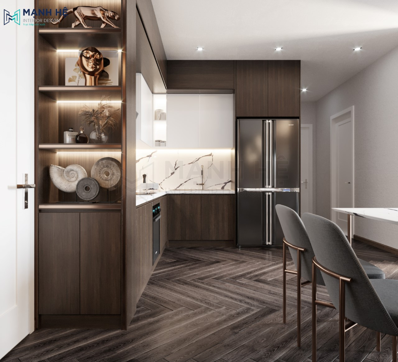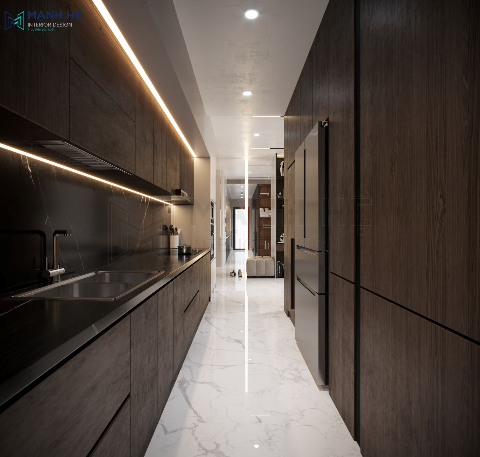 Nội thất phòng bếp căn hộ gỗ óc chó sang trọng, lót sàn đồng bộ