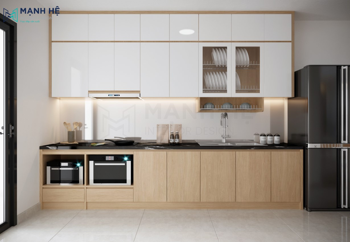 Hệ thống tủ bếp được sắp xếp và bố trí chạy dọc, tối ưu theo đặc điểm của không gian
