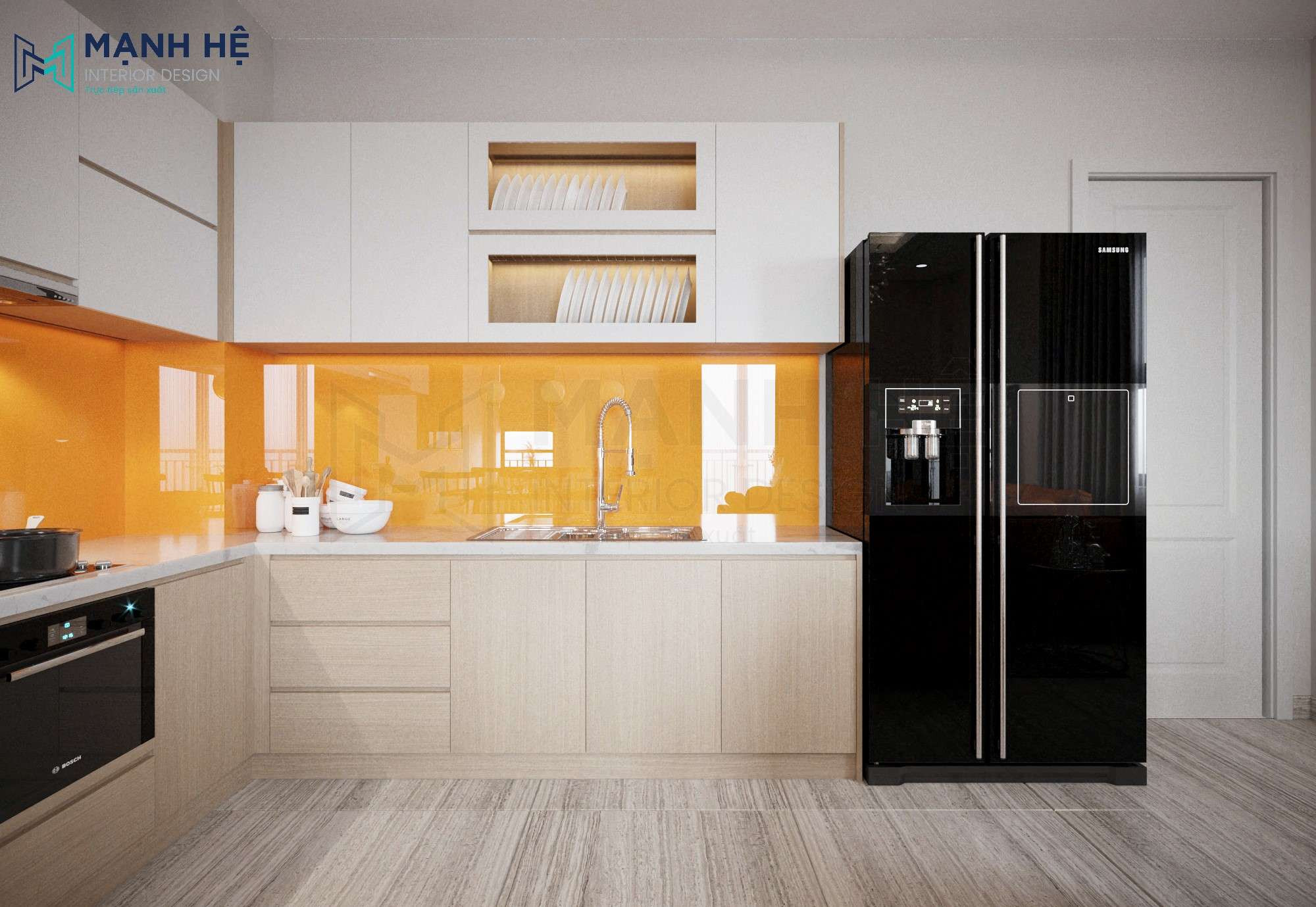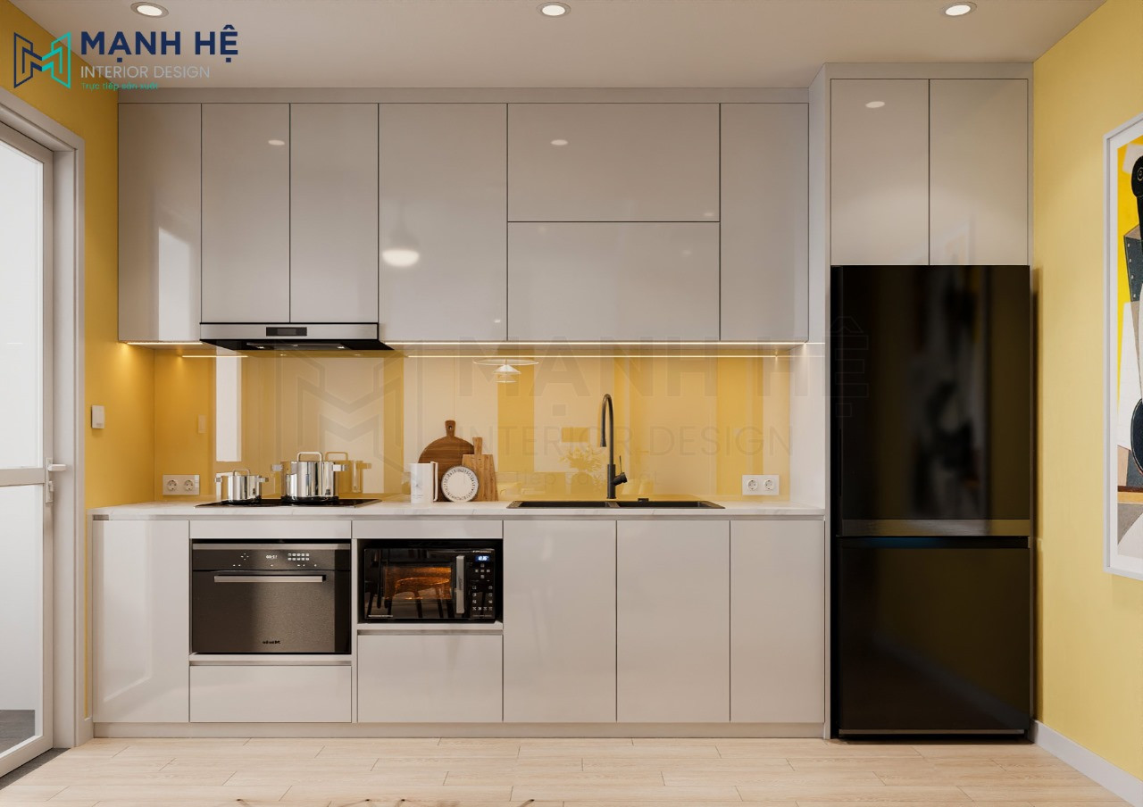 Mẫu 25: Thiết Kế Tủ Bếp Chung Cư Với Kính Bếp Màu Vàng Nổi Bật
