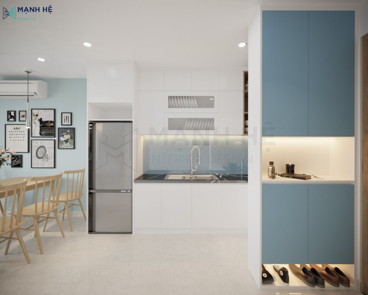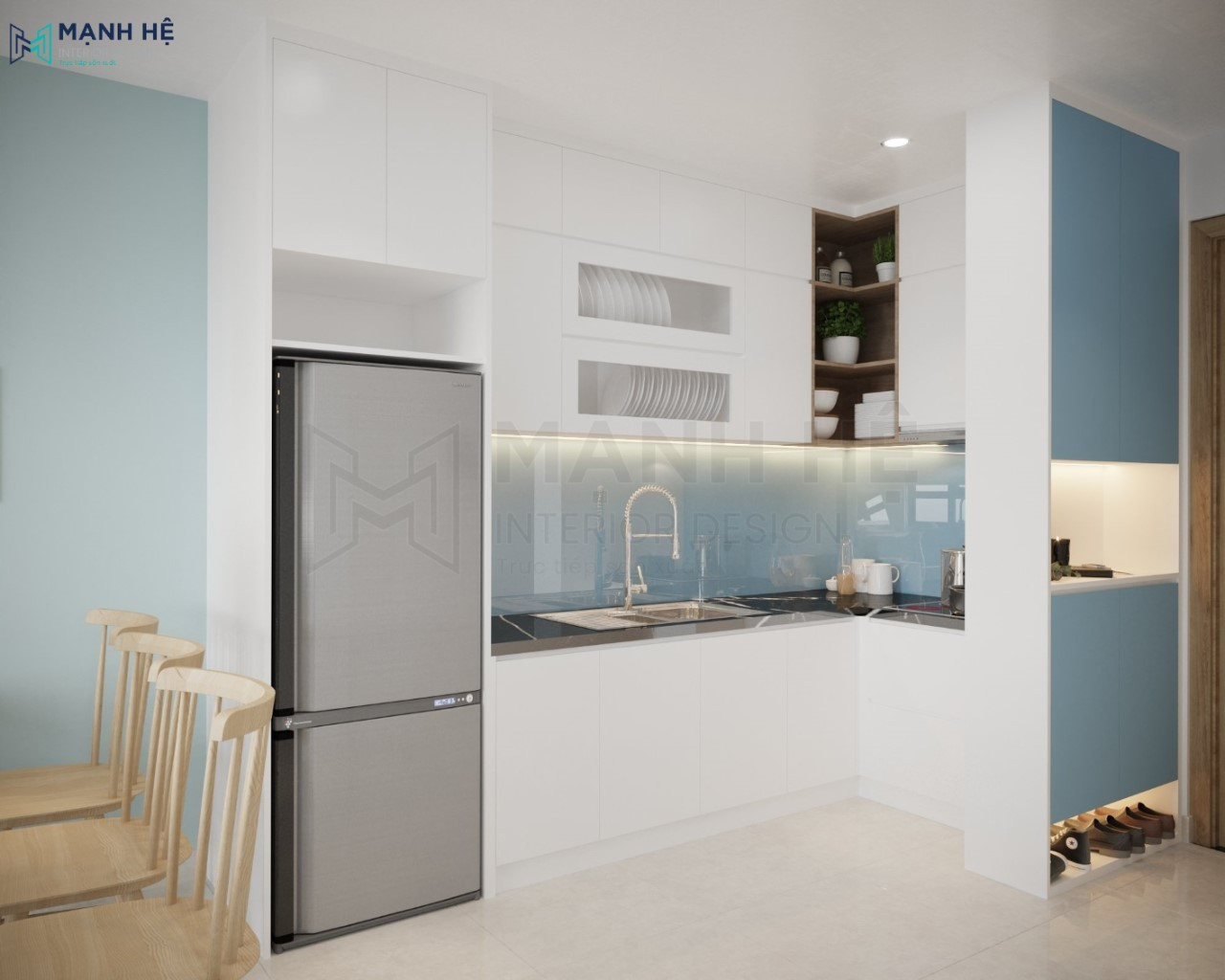 Tổng thể không gian phòng bếp với gam màu trắng chủ đạo kết hợp màu xanh nổi bật