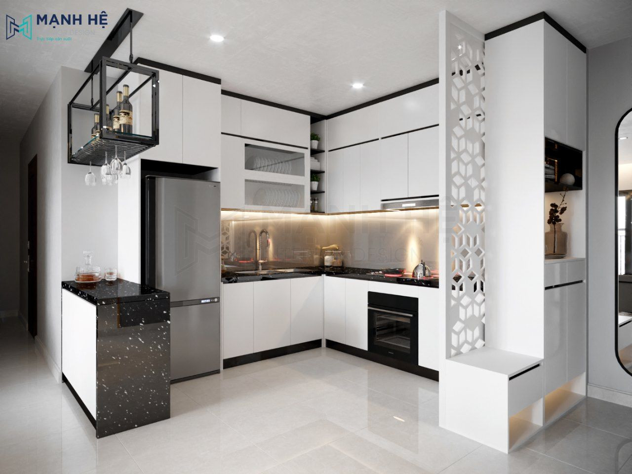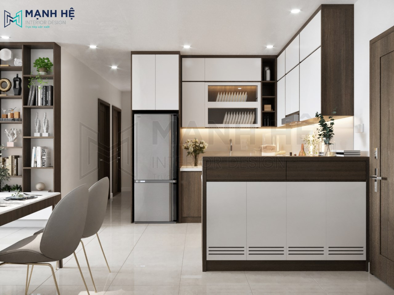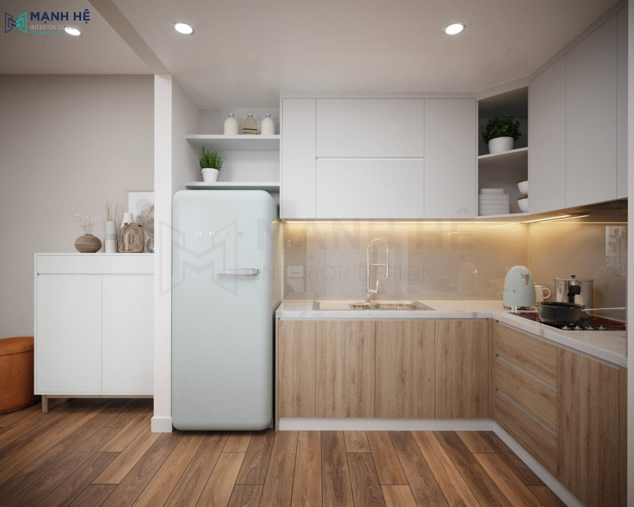 Mẫu 1: Thiết Kế Phòng Bếp Nhỏ Đẹp Cho Căn Hộ Tiện Nghi 2 Phòng Ngủ