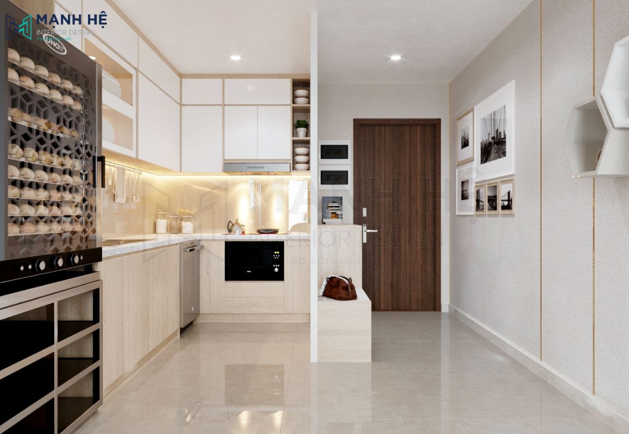 Tủ bếp kết hợp tủ trang trí đặt ngay cửa ra vào đồng bộ nội thất căn nhà đem lại giá trị thẩm mỹ tinh tế
