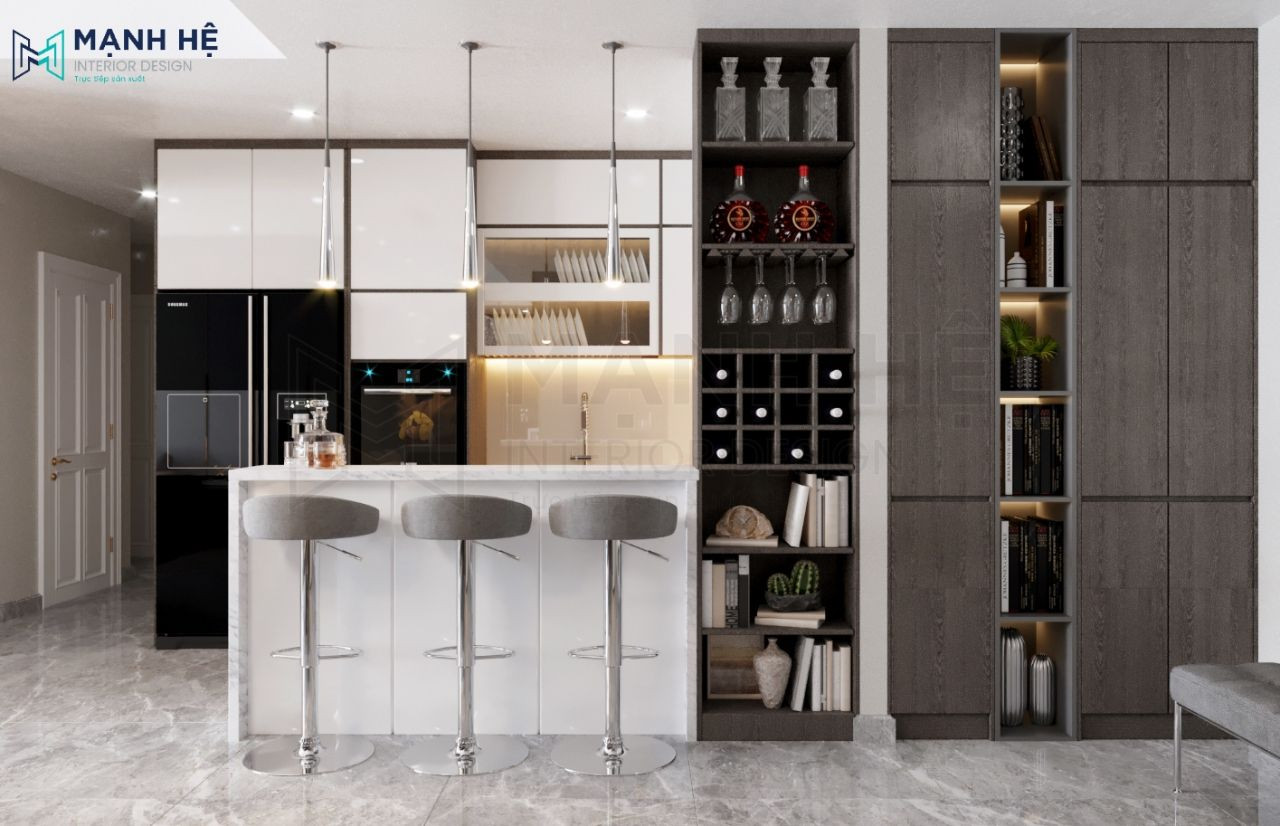 Việc tích hợp một quầy bar mini vào thiết kế bếp chung cư sẽ tạo nên điểm nhấn sang trọng. Bên cạnh tủ bếp đầy đủ tiện nghi, quầy bar với khoang cất rượu và treo ly sẽ là nơi lý tưởng để giao lưu. Để tăng không gian lưu trữ và tạo sự thoáng đãng, hãy cân nhắc thiết kế tủ bếp ôm sát trần.