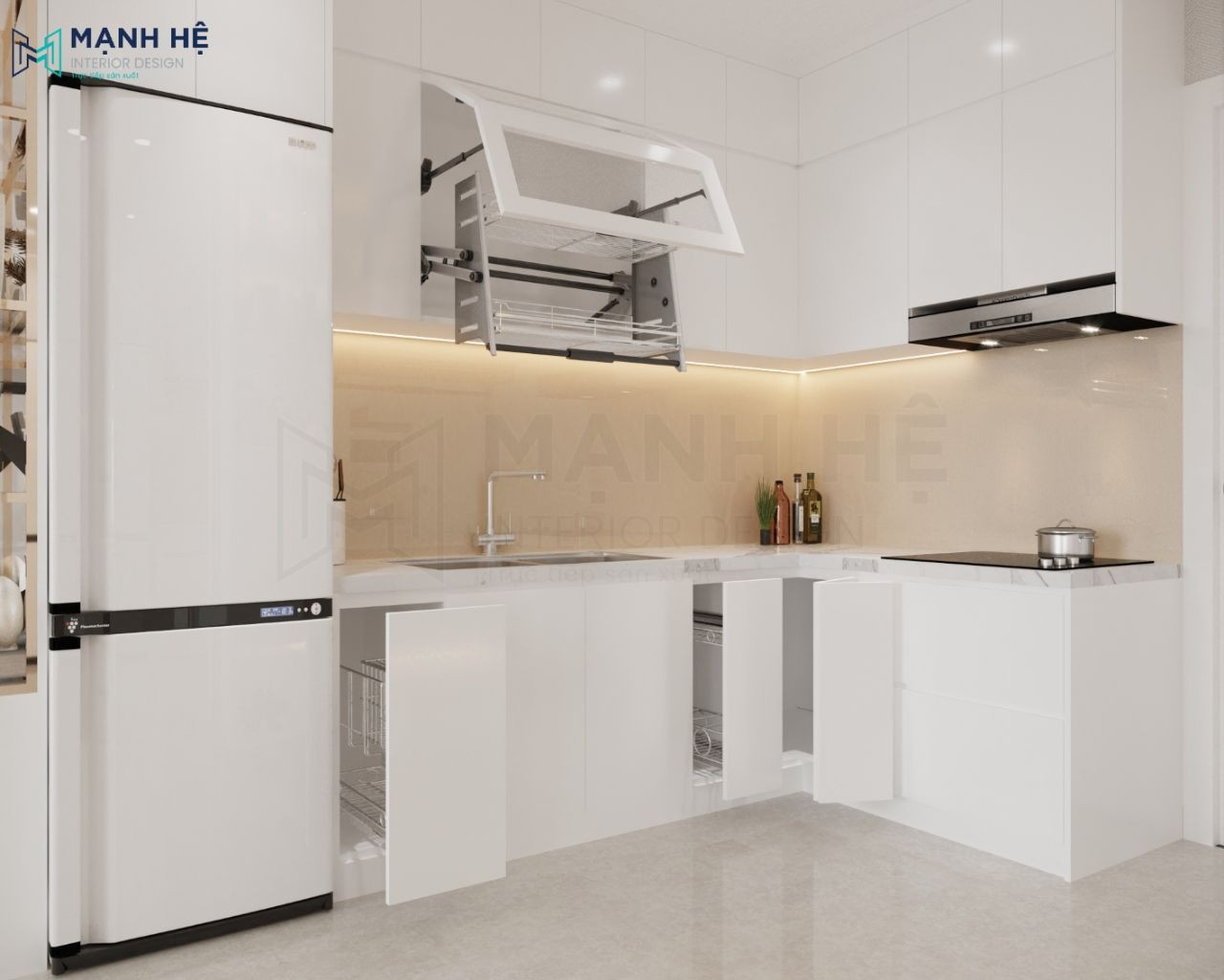 Mẫu 22: Thiết Kế Tủ Bếp Chung Cư Đẹp Chữ L Cánh Trắng Acrylic