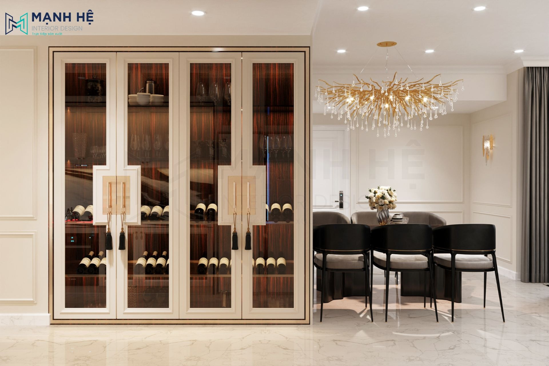 Tủ rượu cánh kính sang trọng đồng bộ chất liệu, màu sắc nội thất phòng bếp