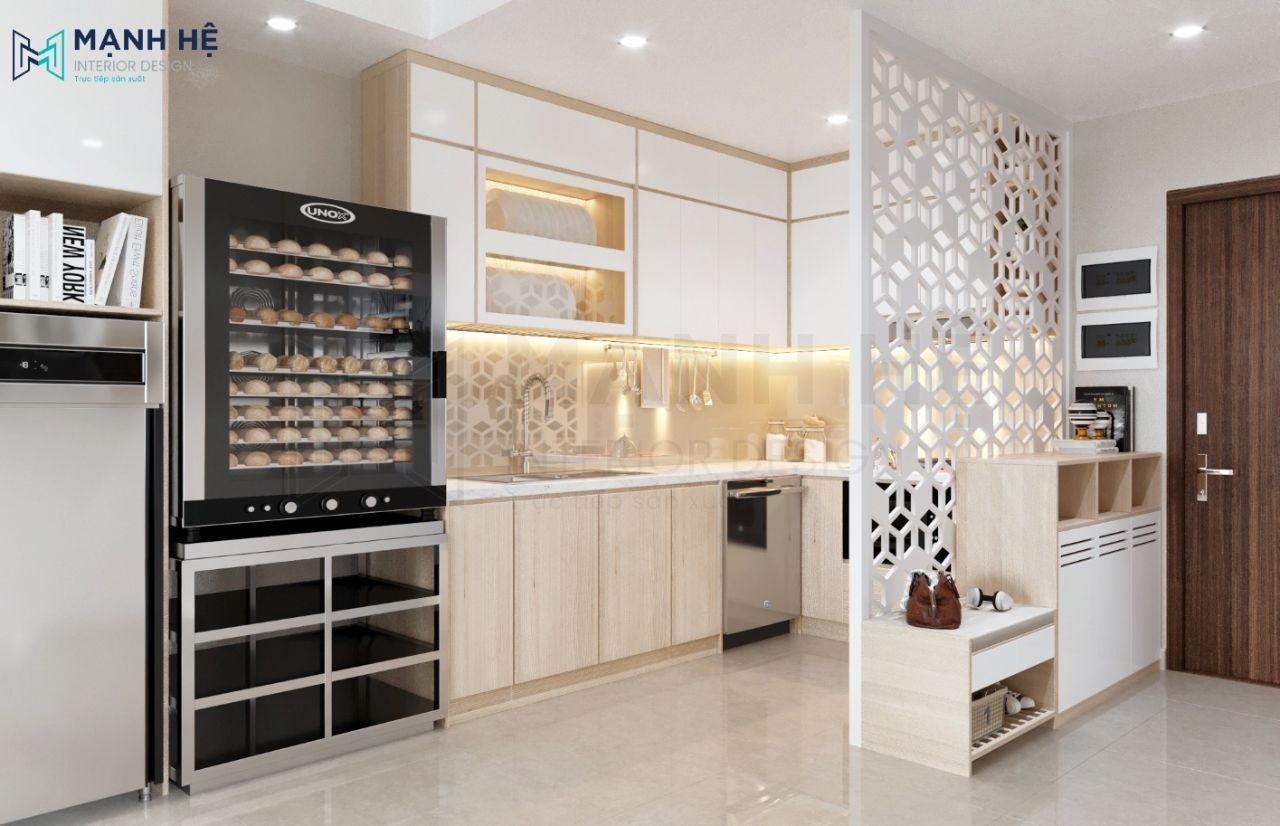 Vách CNC cách điệu hoa văn tinh tế cho khu vực bếp riêng tư nối liền tủ giày