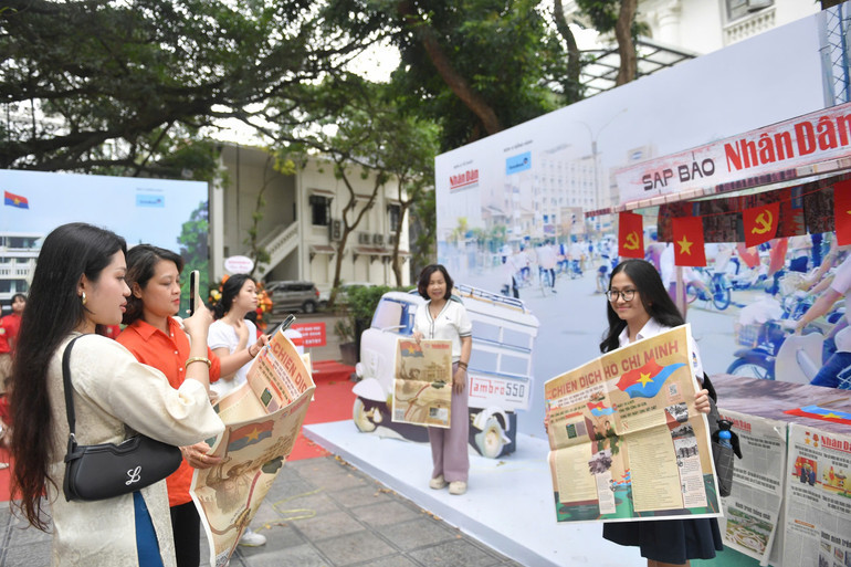 Độc giả tham gia check-in tại triển lãm tương tác, nơi phát phụ san báo Nhân Dân đặc biệt và trả lời câu hỏi phụ san báo nhân dân lấy ở đâu.