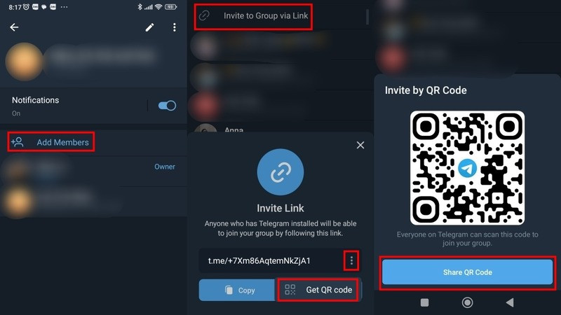 Tùy chọn &quot;Thêm thành viên&quot; trong nhóm Telegram trên Android, bao gồm lựa chọn mời qua mã QR để biết quét mã telegram ở đâuTùy chọn "Thêm thành viên" trong nhóm Telegram trên Android, bao gồm lựa chọn mời qua mã QR để biết quét mã telegram ở đâu