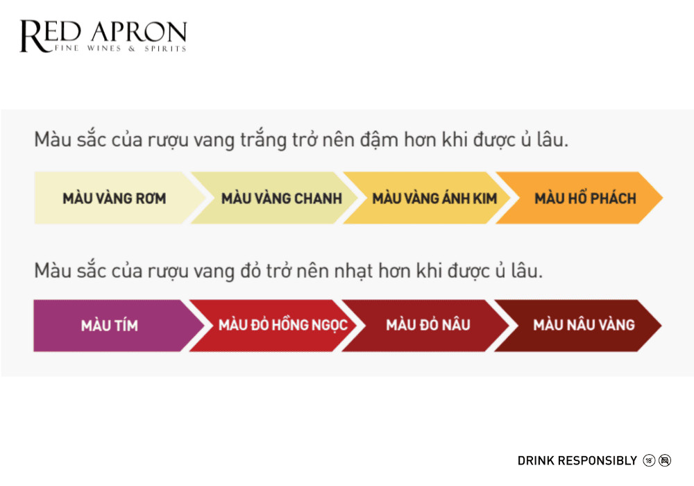 - Vang đỏ: Màu sắc bắt đầu từ tím đậm (vang rất trẻ), đỏ hồng ngọc (vang trẻ đến trung niên), đỏ nâu (vang đã lão hóa) và cuối cùng là màu nâu vàng (vang rất già).