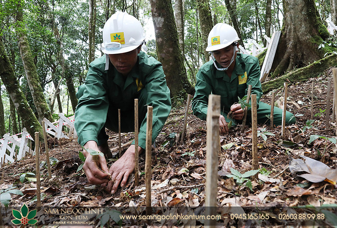 Công nhân đang trồng sâm Ngọc Linh dưới tán rừng, minh chứng sâm Ngọc Linh ở đâu được chăm sóc
