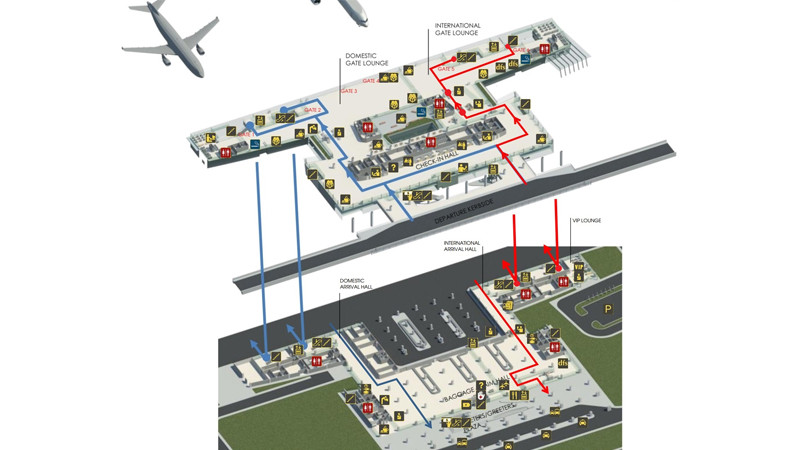 Sơ đồ bố trí chi tiết nhà ga hành khách sân bay Cát Bi, giúp hành khách dễ dàng tìm kiếm các khu vực chức năng, từ đó hiểu rõ hơn về cách tổ chức của sân bay Cát Bi ở đâu trong không gian.