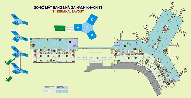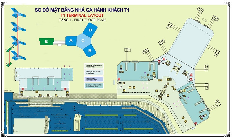 - Tầng 1: Khu vực Sảnh Quốc tế đến, nơi hành khách làm thủ tục nhập cảnh.