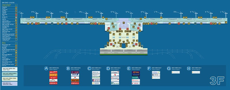 - Tầng 3: Khu vực Sảnh Quốc tế đi, nơi hành khách làm thủ tục xuất cảnh và chờ chuyến bay.