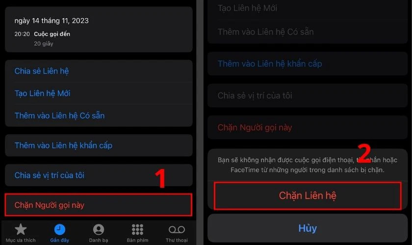 - Bước 3: Trên trang thông tin chi tiết, cuộn xuống dưới cùng và chọn “Chặn người gọi này”. Một cửa sổ xác nhận sẽ hiện ra, bạn chọn “Chặn liên hệ” để xác nhận. Sau khi chặn, bạn sẽ không nhận được cuộc gọi hay tin nhắn từ số điện thoại đó nữa.